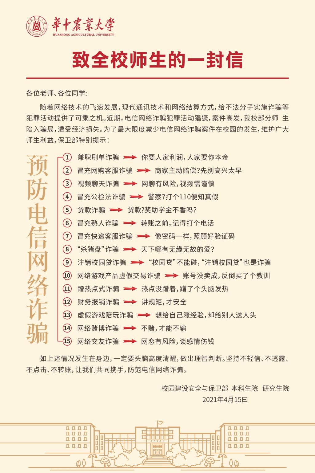致全校师生的一封信(预防电信网络诈骗)